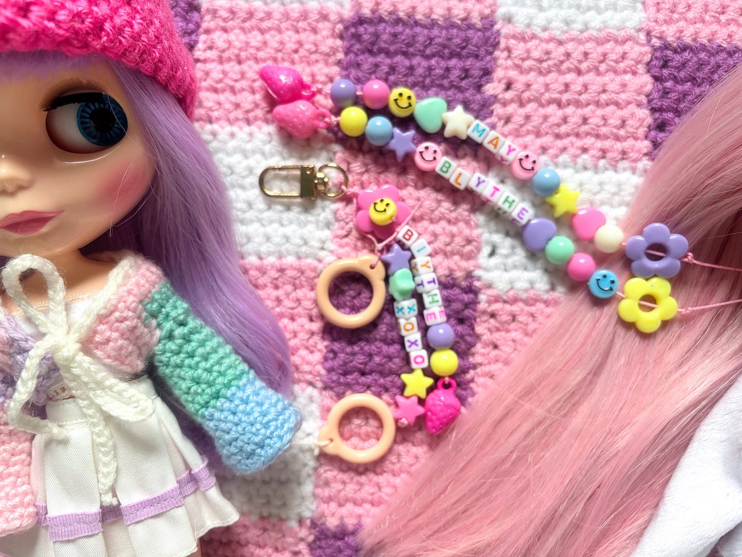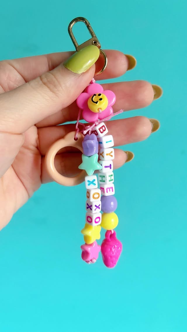 To create this keychain, I used the same colorful beads that I used for May’s pullstring to make the matching pullstring keychain, I used an ‘I’ instead because I ran out of the letter ‘L’. I also found May’s original peach-colored pull ring that all standard Blythe dolls come with. Since I wasn’t using it for anything, I tied it to the keychain. This way, I could infuse more Blytheness to the keychain. I loved how it turned out!
